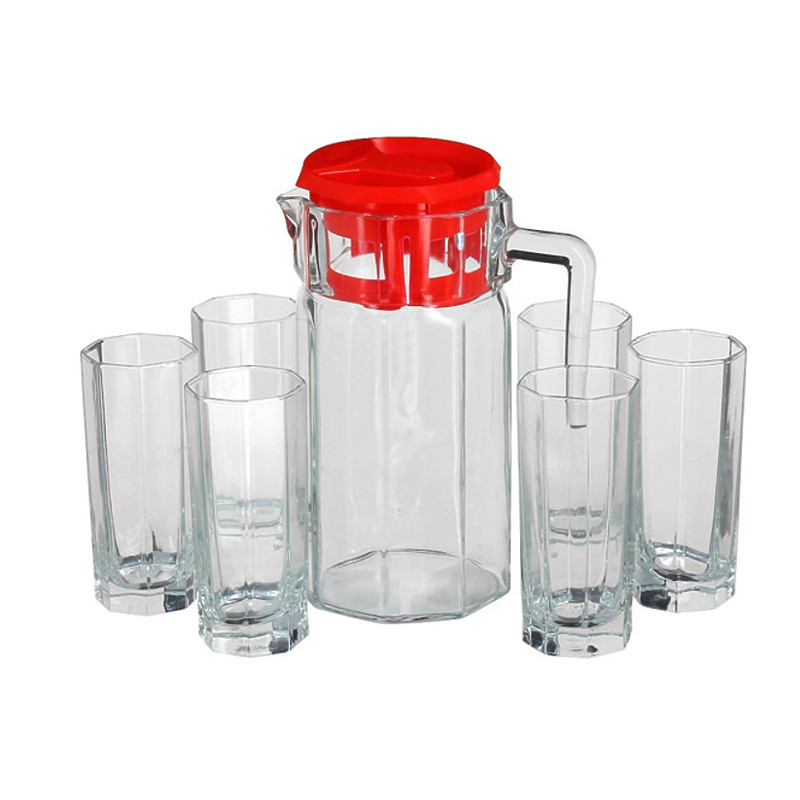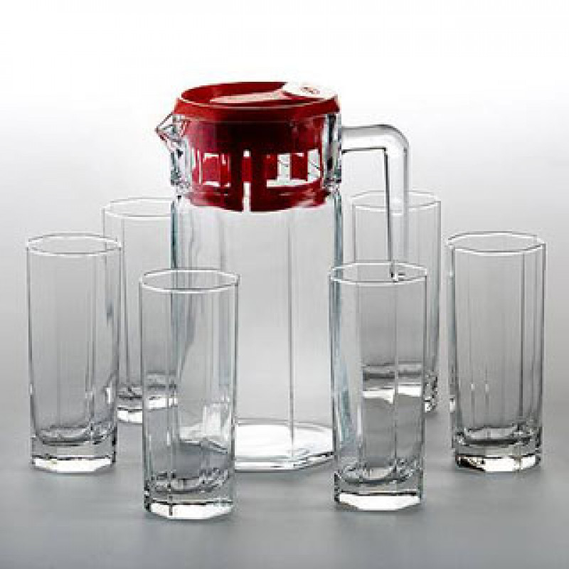 Набір включає в себе 6 стаканів об'ємом 265мл та кувшин об'ємом 1,5л. Призначений для подачі холодних напоїв, таких як сік, вода, компот, тощо. Завдяки своєму дизайну він підійде для сервіровки будь якого столу. Якісне скло є стійкішим до ударів, у порівнянні зі звичайним. Його можна мити у посудомийній машині.