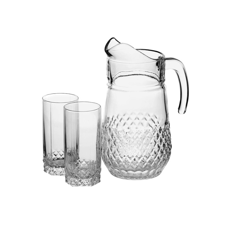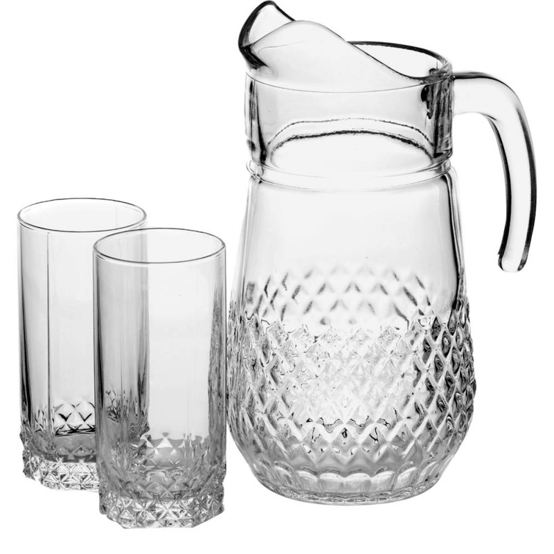 Набір включає в себе 6 стаканів об'ємом 275мл та кувшин об'ємом 1,34л. Призначений для подачі холодних напоїв, таких як сік, вода, компот, тощо. Завдяки своєму дизайну він підійде для сервіровки будь якого столу. Якісне скло є стійкішим до ударів, у порівнянні зі звичайним. Його можна мити у посудомийній машині.