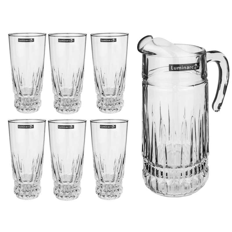 Елегантний набір для соку. Включає в себе 6 стаканів об'ємом 270мл та кувшин об'ємом 1.6л.Зроблені з ударостійкого скла. Поверхня є гладкою та не дозволяє з'явитись плямам та подряпинам. Можна мити в посудомийній машині.