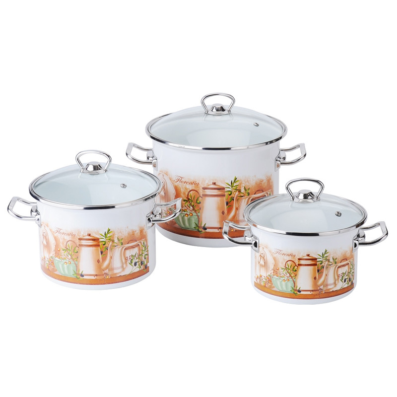 Набір емальованого посуду від ТОВ «Новомосковський посуд». Виконано в стилі «Модерн». Посуд в наборі комплектується скляною кришкою і нержавіючою фурнітурою. Набір упаковується в індивідуальну упаковку.