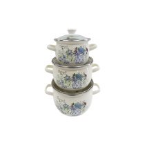 У набір входять 3 каструлі з емальованої сталі зі скляними кришками. Об'єми каструль: 1,5 л, 2,5 л, 3,5 л.