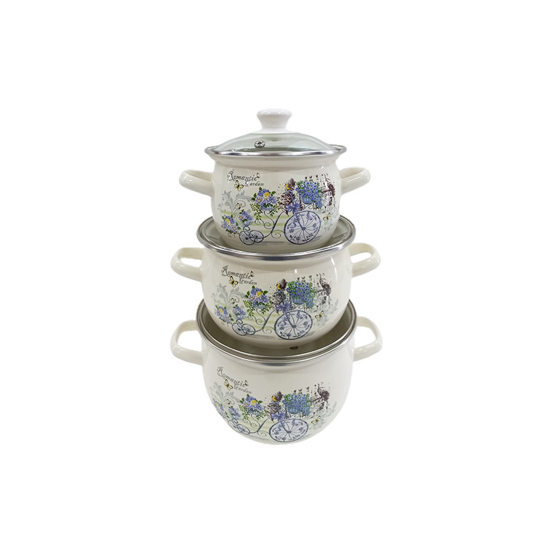 У набір входять 3 каструлі з емальованої сталі зі скляними кришками. Об'єми каструль: 1,5 л, 2,5 л, 3,5 л.