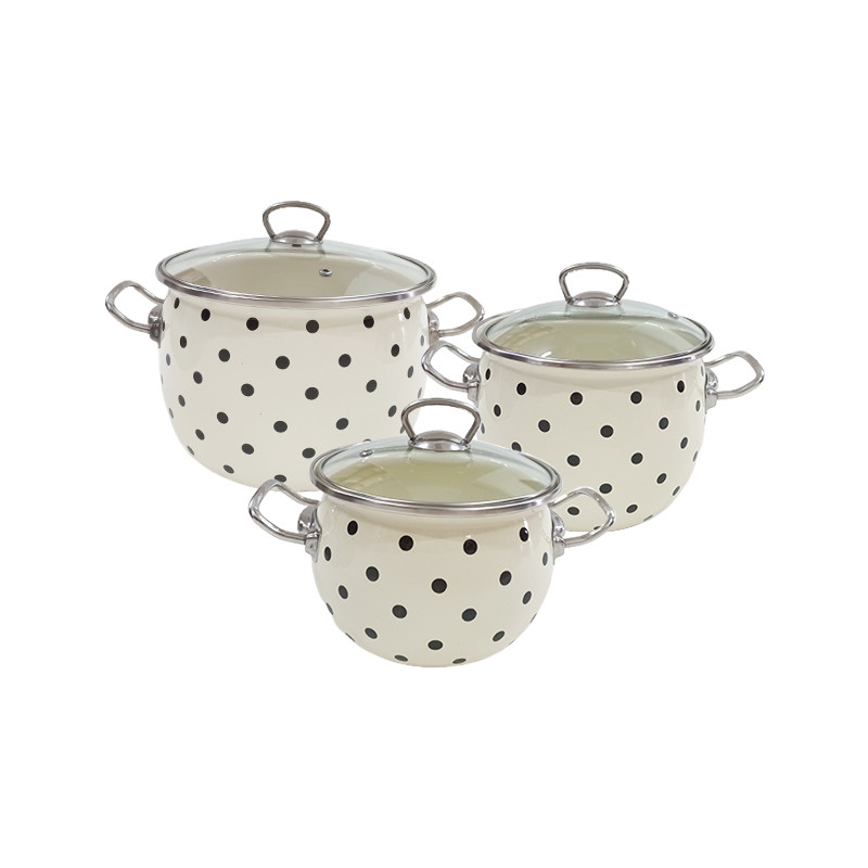 В наборе 3 эмалированные кастрюли со стеклянными крышками и металлическими ручками. Объемы кастрюль: 2,5л, 3,5л, 5л.