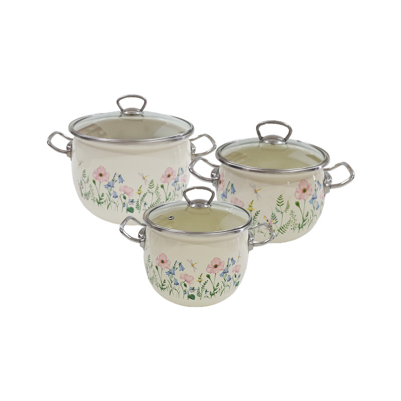 В наборі 3 емальовані каструлі зі скляними кришками та металевими ручками. Об'єми каструль: 2,5 л, 3,5 л, 5 л.