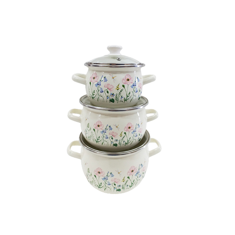 У набір входять 3 каструлі з емальованої сталі зі скляними кришками. Об'єми каструль: 1,5 л, 2,5 л, 3,5 л.