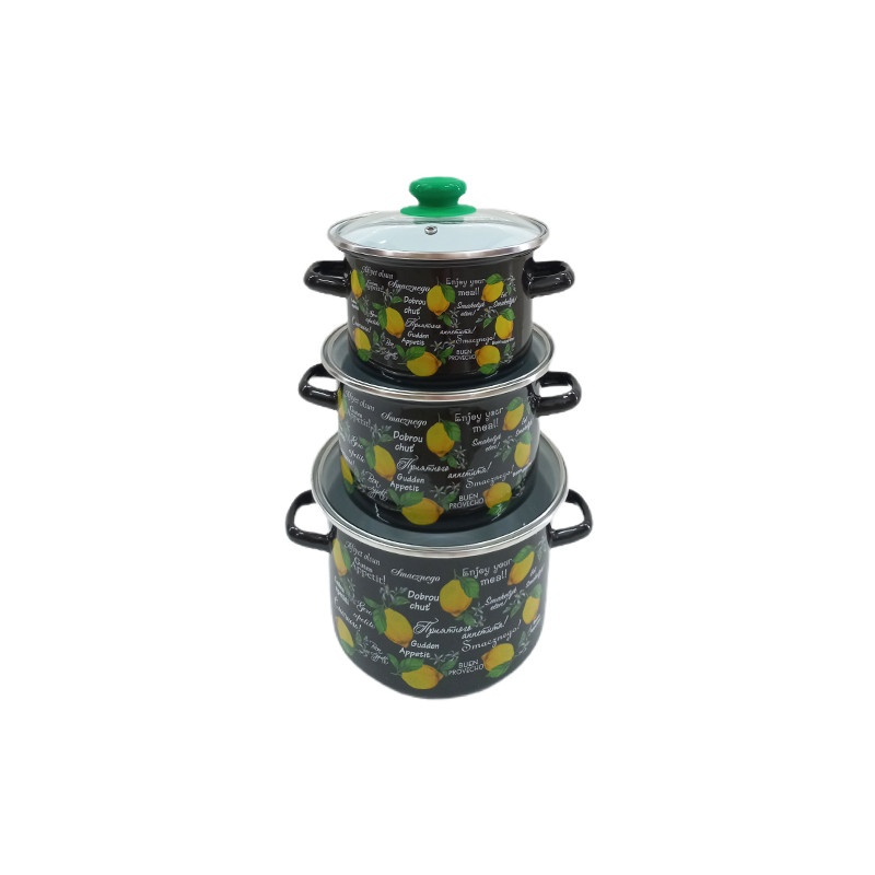 В наборі 3 емальовані каструлі зі скляними кришками. Об'єми каструль: 2 л, 3 л, 5,5 л.