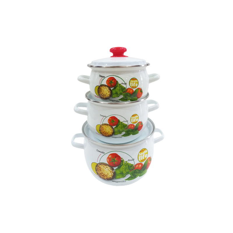 В наборі 3 емальовані каструлі з емальованими кришками. Об'єми каструль: 2,5 л, 3,5 л, 5 л.