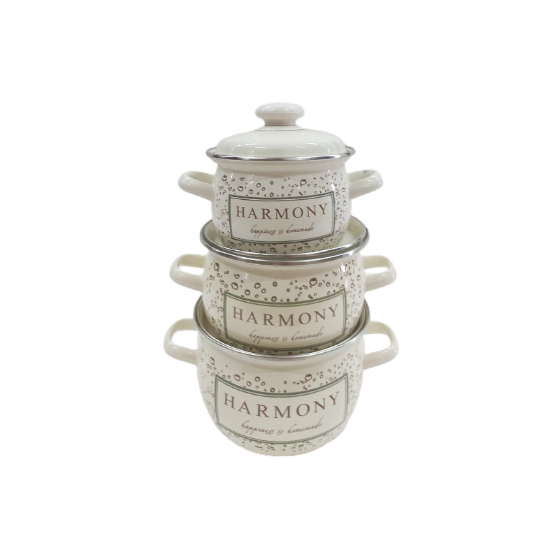 В наборі 3 емальовані каструлі з емальованими кришками. Об'єми каструль: 1,5 л, 2,5 л, 3,5 л.