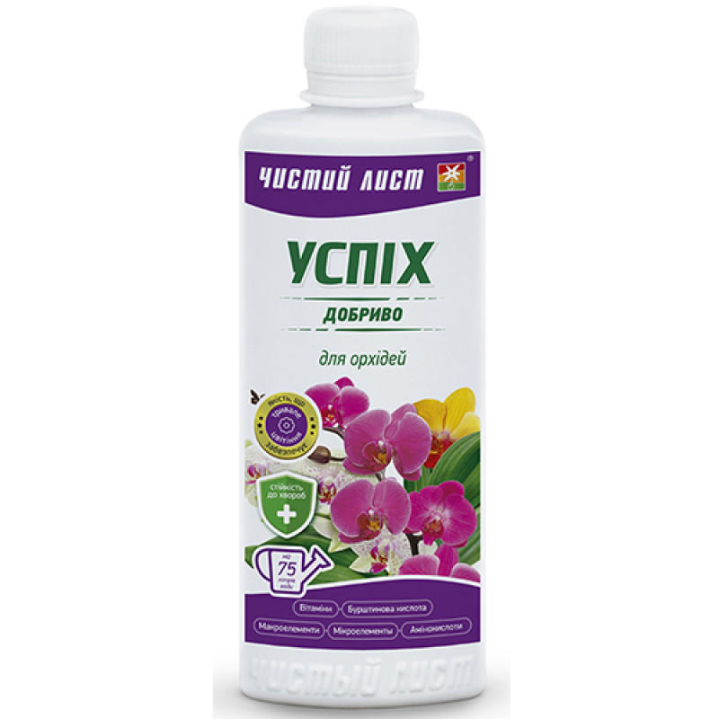 Успіх для Орхидей - рідке концентроване добриво для всіх видів орхідних рослин: орхідей, фаленопсис, каттлея, дендробиум, ванда, одонтоглоссум, Камбрія, лелія, цімбідум, брас. Збалансована підгодівля забезпечить домашнім орхідей чистий аркуш і регулярне цвітіння. Препарат повний комплекс елементів живлення, вітамінів, стимуляторів, які підтримують зростання і здоров'я рослин. Використовувати Успіх для Орхидей можна як для поливу, так і для занурення в розчин контейнерів-кошиків з рослинами.