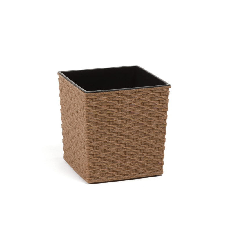 Горщик стійкий до ультрафіолетових променіві має поверхню, що імітує плетіння із ротангу. Він складається з двох елементів - декоративного корпусу і чорного вкладу, який може легко вийматися.