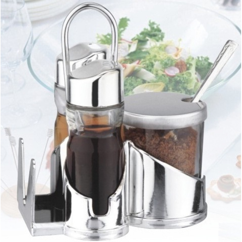 Набір для спецій. Включає в себе три скляні ємності з металевою оправою та ложечку.