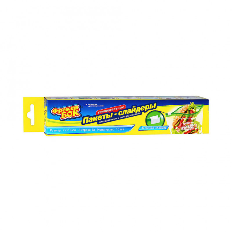 Універсальні пакети-слайдери торгової марки Фрекен БОК призначені для зберігання, заморожування і упаковки харчових і нехарчових продуктів. Замок-слайдер надійно і герметично закриває пакет і запобігає витікання рідин, а також спрощує процес відкривання. Пакети-слайдери виготовлені з міцного поліетилену LD товщиною 40 мкм, завдяки якому продукти не прилипають до пакету при заморожуванні. На пакеті є спеціальна область для запису інформації про вміст і датою заморозки.