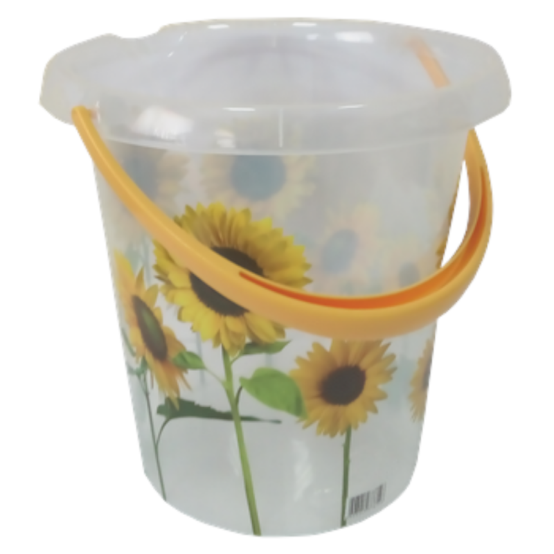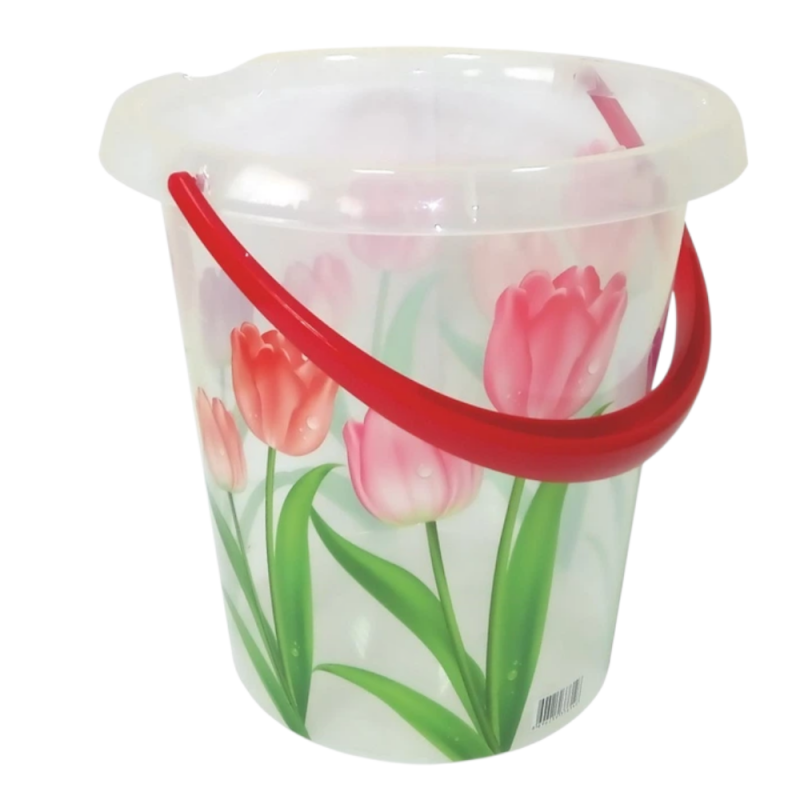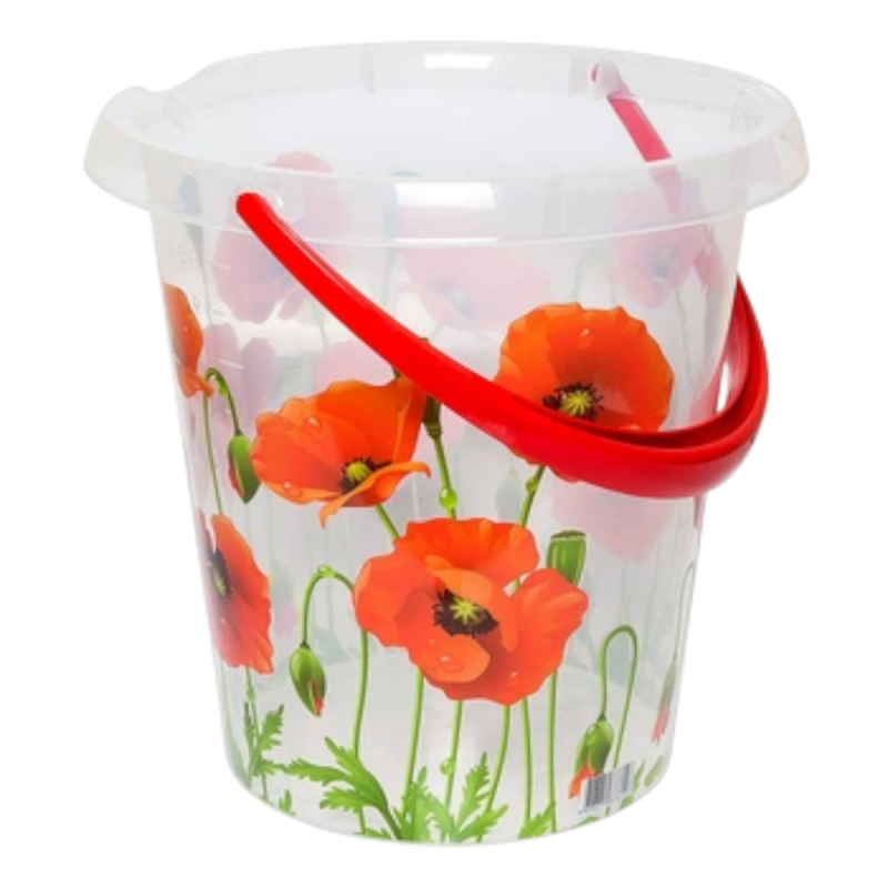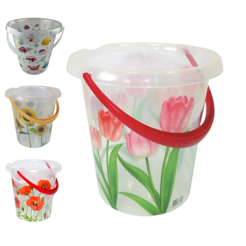 Відро декороване малюнком об'ємом 12 л із міцного прозорого харчового пластику. Міцна пластикова ручка витримує вагу наповненого відра. Використовується для зберігання та перенесення холодної питної води, молока, інших харчових та не харчових рідин, овочів, фруктів, а також для інших господарських цілей.