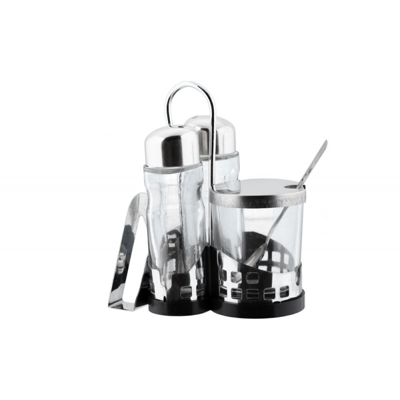 Набір для спецій. Включає в себе три скляні ємності з металевою оправою та ложечку.