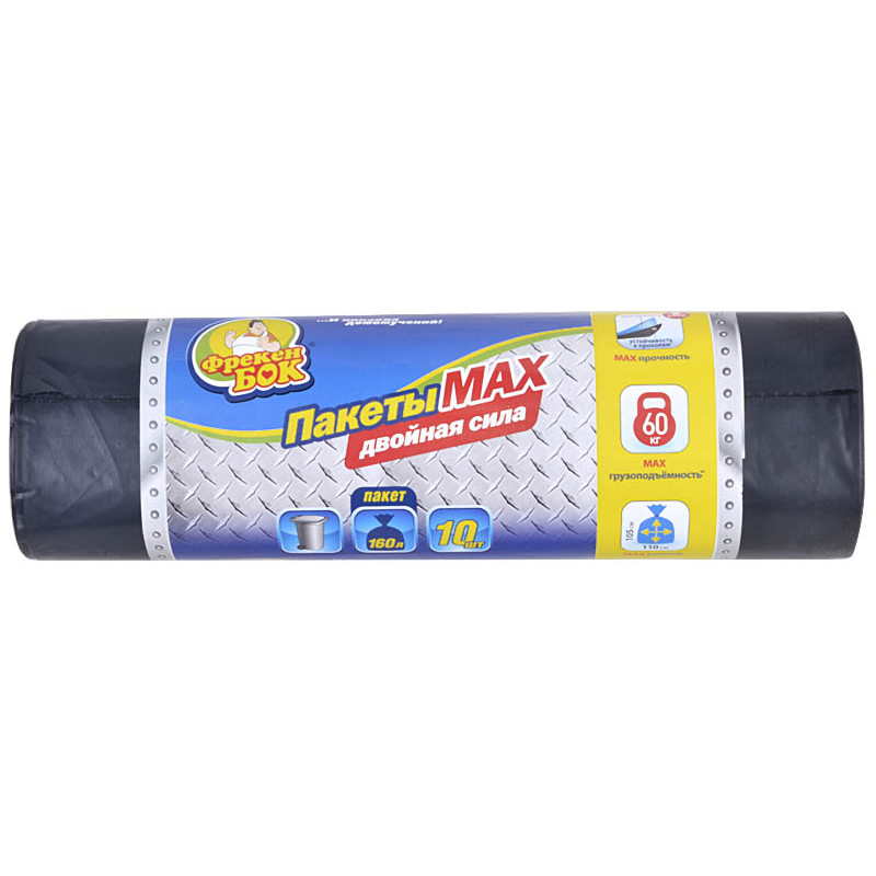 Пакети для сміття Фрекен БОК MAX 160 л відмінно підійдуть для сміттєвих баків 40-50 літрів, нестандартного і великогабаритного сміття. Матеріал: Плівка з суміші поліетиленів низької і високої щільності (LD / HD) отримана багатошарової екструзії. Товщина: 45 мкм. Пакети для сміття ФБ MAX 105*110/160 л 10 шт