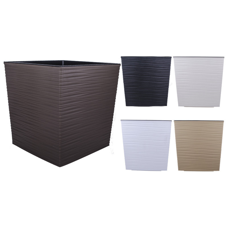 Горщик терасний Ламела Юка Долото 25 см з вкладом 599 має квадратну форму, але також незвичайну поверхню, що імітує різьблення долотом по дереву. Він складається з двох елементів - декоративного корпусу і чорного вкладу, який може легко вийматися. Без контейнера кашпо може бути використане як ваза для живих або штучних квітів. Для відводу надлишку води передбачений дренажний отвір.