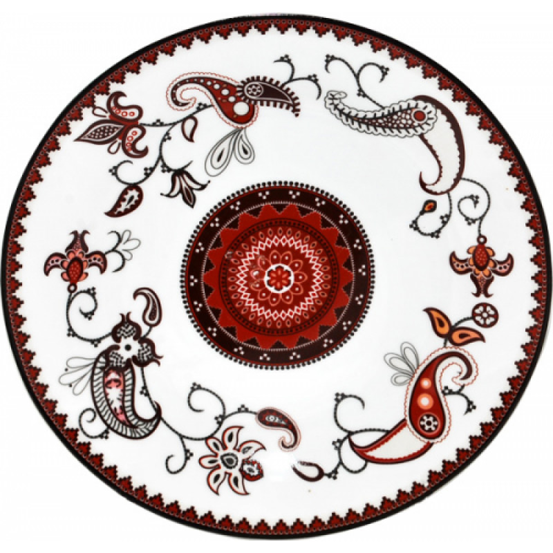 Тарілка 9" Орнамент 30002-1465 Кругла тарілка ідеально підійде для подачі перших і гарячих страв. посуд виконана в білому кольорі з чорно-бордовим орнаментом по краях. Діаметр становить 23 см, що є стандартом для подібних виробів. Керамічні тарілки «Орнамент» послужать відмінним доповненням до столу, особливо якщо ви шанувальник класики. Кераміка - це правильне рішення в сторону екологічності та гігієни. З неї абсолютно безпечно їсти навіть вашим дітям. Завдяки прозорій глазурі зі скла, яка становить верхнє покриття приладу, посуд легко миється, а не вбирає запахи і жир.