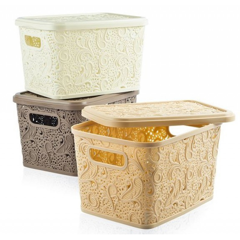 Кошик 17 л призначений для зберігання корисних дрібниць компактний, зручний і практичний. Організатор для зберігання являє собою контейнер прямокутної форми, з кришкою. Модель кошика має отвори для циркуляції повітря. Універсальна корзинка плетінка виготовлена з високоякісного кольорового пластику, з боків є ручки-вуші, бічні стінки виконані у вигляді мереживних візерунків.