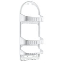 Високі яруси дозволять зберігати на полиці засоби гігієни у великих флаконах. На нижньому ярусі полиці передбачені гачки для мочалок. Зроблена з легкого і міцного пластику, проста в збірці.