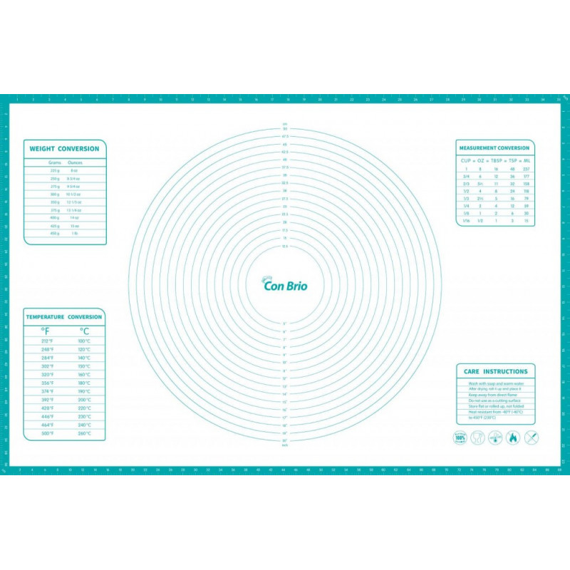 Силіконовий килимок Con Бріо. Може використовуватися в газових, електричних і мікрохвильових печах. Не ковзає на поверхні столу, тісто не прилипає до килимка. Має антипригарні властивості, може використовуватися для випікання тіста. Не вбирає запахи, міцний, надійний, довговічний. Легко миється, простий в зберіганні та догляді. Розмір: 61х91 см.